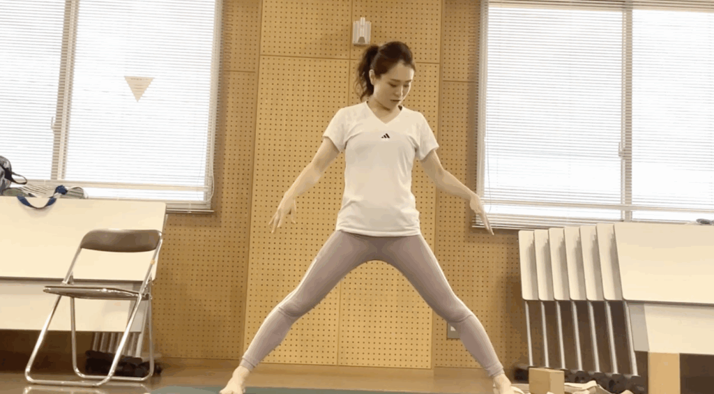 - 脚を大きく開き、足の小指側を平行にする。