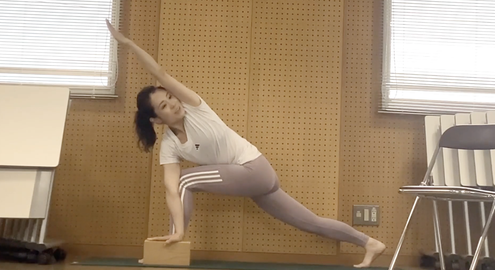 ③ 左手をブロックの上に置き、背骨を長く伸ばす。
