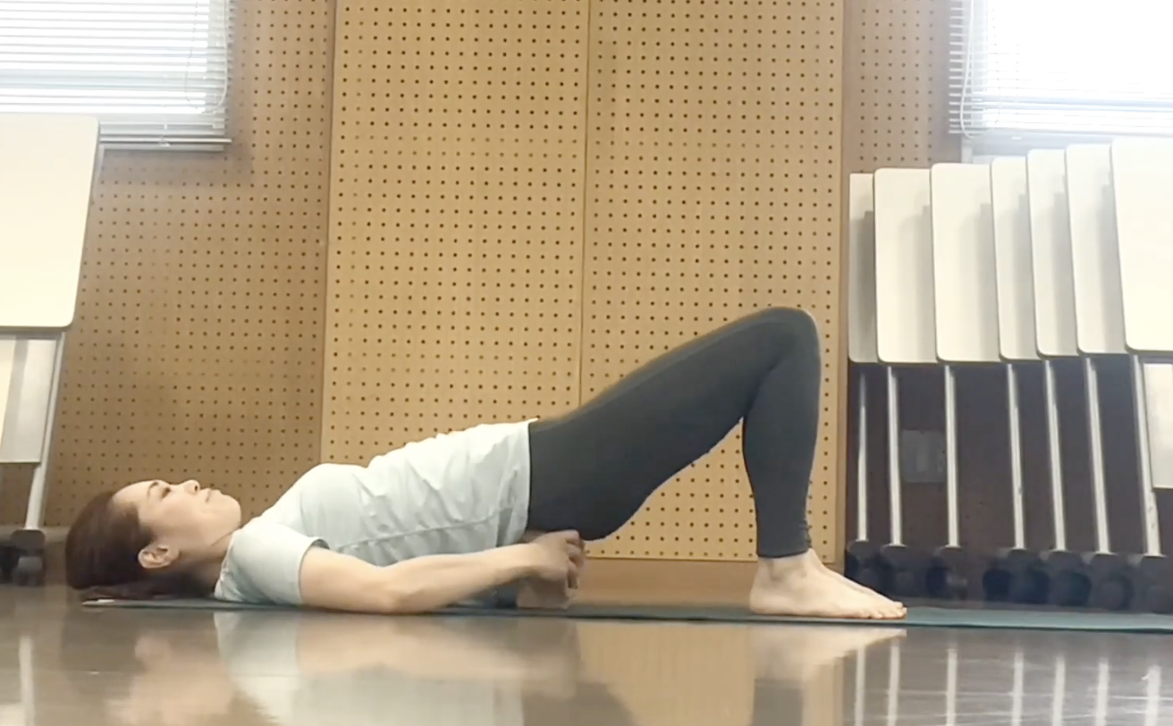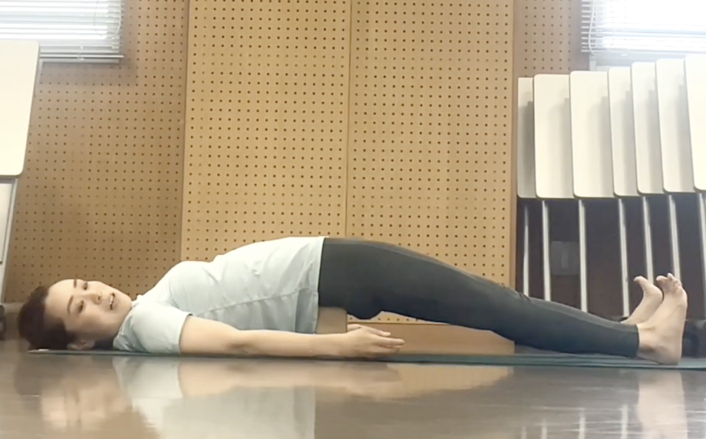- かかとはお尻に近づけて、骨盤を持ち上げ、仙骨(尾骨ではなく、少し上) の下にブロックを置く