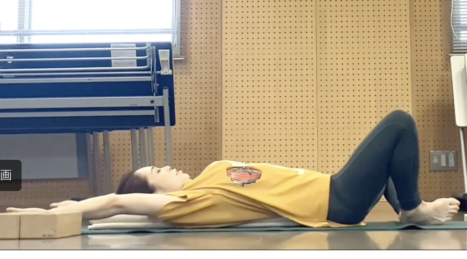 - 腰や股関節に違和感がある場合は、膝の下や太ももの下にブランケットかブロックを入れて支えます。