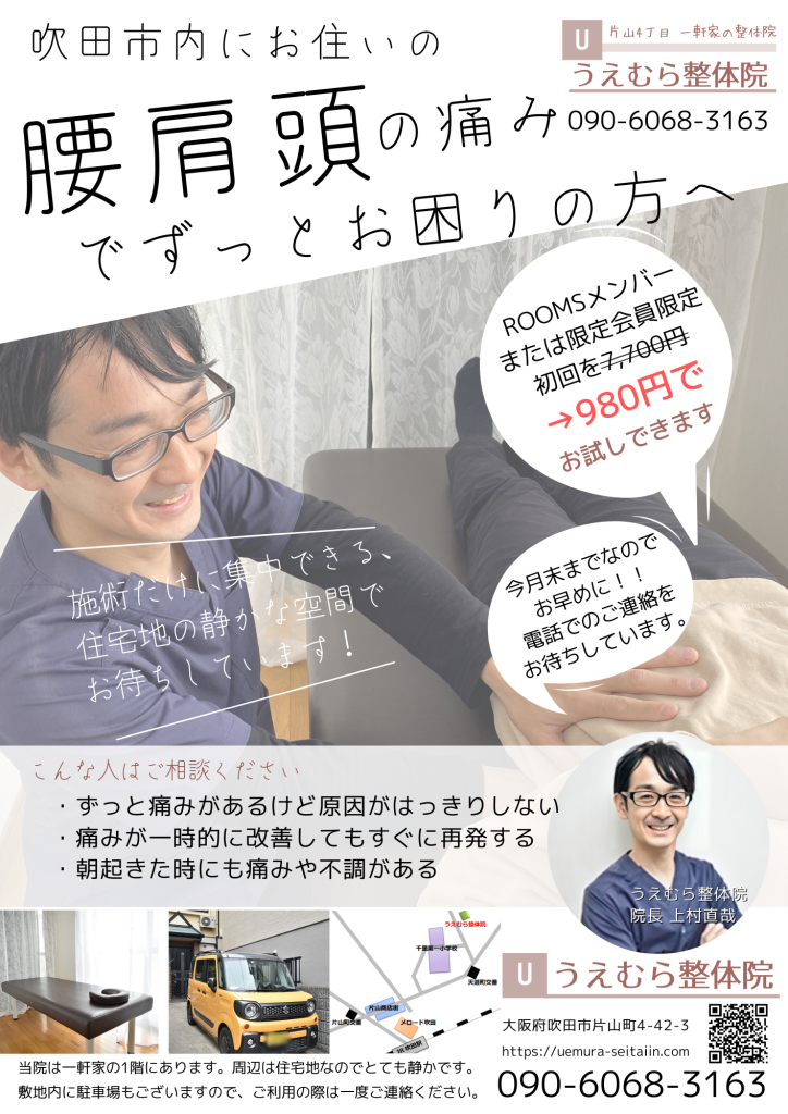 大阪府吹田市にある自律神経症状専門の整体院、「うえむら整体院」の院長をしております、上村直哉と申します。